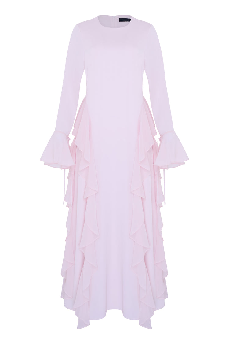 The back of the dress has a corset-style lace-up detail, providing an adjustable fit and a touch of vintage charm. The buttery fabric is soft and fluid, draping beautifully. Modest, yet fashion-forward, this dress is perfect for formal occasions or special events, combining classic elegance with modern flair.